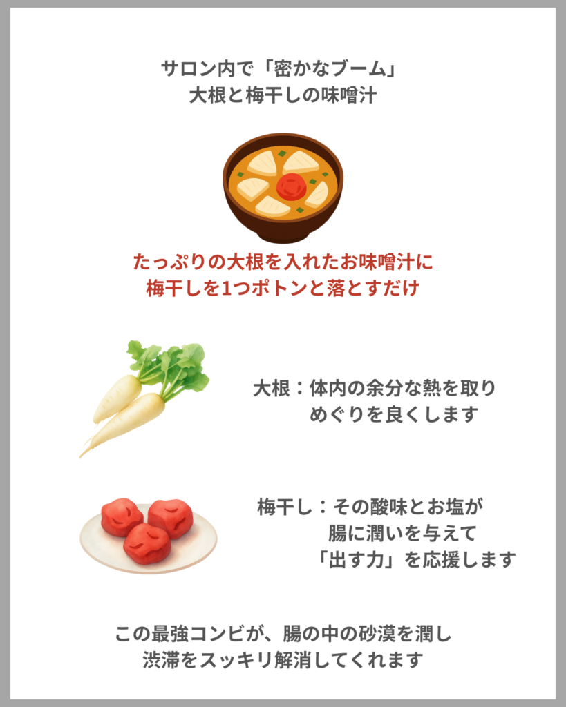 ② 食:サロン秘伝!「梅干し大根」のお味噌汁